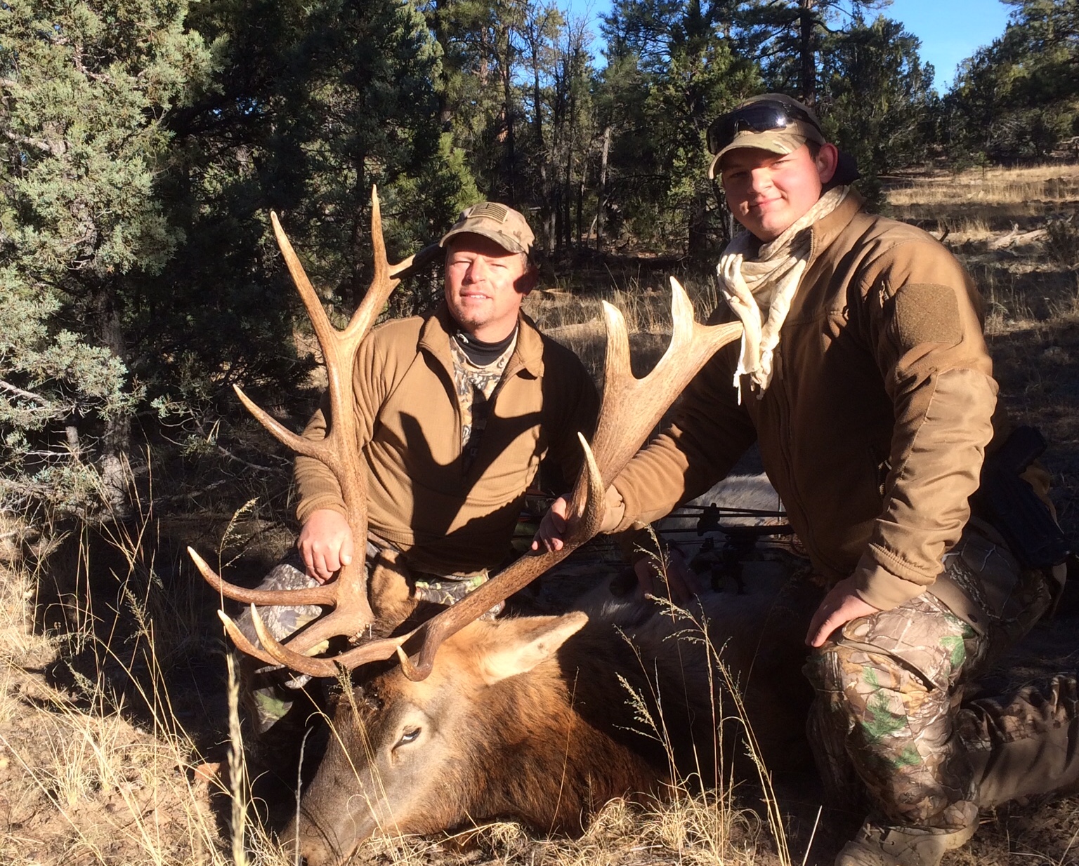 This adventure started last year when when my daughters boyfriend Marvin Snodgrass shot and tagged a beautiful 4x4 mule deer that scored 177 7/8 last year.Not to be out done his dad, Jeff put in for the same unit this year and was drawn and told Marvin that he was holding out for a 180" deer to best Marvin. At the age of 27, Marvin is an extremely accomplished hunter. He has been taught By Jeff from the time he could walk to love the outdoors and has been an avid hunter and fisherman since the time he could hold a fishing pole and rifle. Marvin accepted the challenge of his dad and would do everything he could to help his dad shoot a bigger deer. This adventure took a tragic turn on May 20, 2017, when Jeff died suddenly. To say that this devastated Marvin is an understatement. All of us that have had the opportunity to learn from our fathers growing up and have the fortune as I have to raise a son to love hunting and have the priveledge to hunt with him knows how devastating losing your father far to soon must feel. After Jeff died, friends of Marvin contacted New Mexico Game and Fish and learned that the tag could be signed over to Marvin to complete the quest that Jeff had started. Marvin began channeling his drive to fulfill his dads wish. He took multiple scouting trips, hung trail cams with his brother in law Micah, his best friend Sebastian and my son Kevin in search of a deer worthy of Jeffs scrutiny..Marvin found the deer he was looking for and talked with friends of this site C.C.Cody 171 and his brother Caleb, along with Sebastian and Micah on the score of the deer to make sure he would pass the test of Jeff. Once they all agreed that this deer had the potential to hit the 180" mark, the plan was set. In order to complete this adventure in the right way, Jeffs best friend and hunting partner for the last forty plus years Cleve would ride roughshod over all of us to make sure we were doing it the right way, Jeff's way. Day one- There were four of us helping Marvin. Sebastian, Micah and Marvin were on a ridge about a 1000 yards from where Cleve and I were positioned, all glassing the same basin. The day ended with no sighting of the big buck. Day two- As soon as it is light enough to see, Cleve and I glass up a nice 4x4. We get in touch with Marvin and crew and give them the location. As they begin glassing from their direction they pick up the big 4x4. He beds right at 8 am an never leaves the tree for the entire day. He gets up and moves with the shadows but is still over 1000 yards and never gives Marvin an opportunity. We get some good pics of him bedded and go over them at camp with our crew along with Caleb and Cody. All agree to keep sticking to our plan and the deer will eventually present himself for a makeable shot. Day three - Marvin, Micah and I hike to their glassing point, while Cleve and Sebastian go to the other point as they had planned on leaving around noon as Cleve had a flight back to Denver for a job he is on.Marvin glasses the big buck up as soon as its light enough to see. He was bedded, but gets up and starts feeding toward Cleve and Sebastian. Marvin and Micah head down off the ridge to close the distance to make a shot. Fast forward a few hours after a number of cat and mouse moves, Marvin and Micah close the distance to about 270 yards on the big buck. The buck has them pegged as Sebastian, Cleve and I nervously watch through our binos and spotting scope. We see the bedded buck jump and then hear the sound of the round going off. I stay on the hill to glass the area while Marvin, Micah, Sebastian and Cleve go to find Jeffs buck. Marvin finds the big buck piled up at the base of a tree. For Marvin to have closure on his dads buck, weighed heavy on all of us especially Marvin and Cleve. To fulfill a promise Marvin made to his dad and to see Cleve there as Marvin put Jeff's tag on the buck he had worked so hard for, there are no words. I am grateful to have been a part of such an important event and truly believe Jeff was watching us the entire way and throwing a couple curve balls to see if Marvin could rise to the challenge. I am confident that Jeff would be proud of the way Marvin has handled such adversity and having the satisfaction knowing he raised his son well. Marvin and Sebastian taped the buck at Jeff's bar of 180" and I know he is looking down on the boy that he raised as proud as any father could be of their son. Jeff and Marvin with Marvins 2016 buck Marvin with his promised buck ( i couldn't get it to rotate correctly if someone can fix it, much appreciated) Marvin, Cleve, Micah, me and Sebastian He carries his mass all the way through Marvin and Sebastian putting Jeffs tag on his promised buck